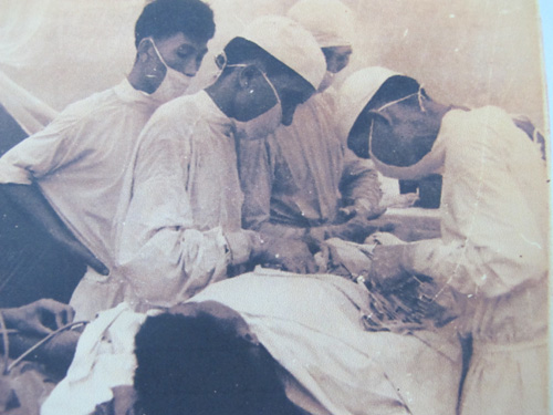 ![]() Bác sỹ Nguyễn Sanh Dân (bìa phải) đang tiến hành mổ lấy đầu đạn cho thương binh tại Bệnh viện K71.B. |